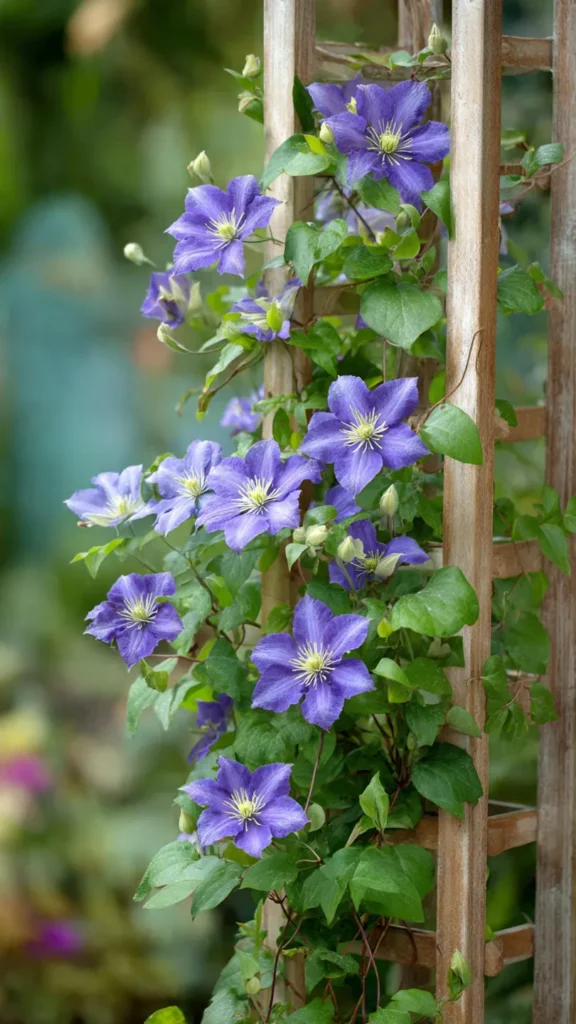 For trellises, arbors, or fences, clematis is a top choice. Its large, star-shaped flowers come in shades of purple, pink, and white.