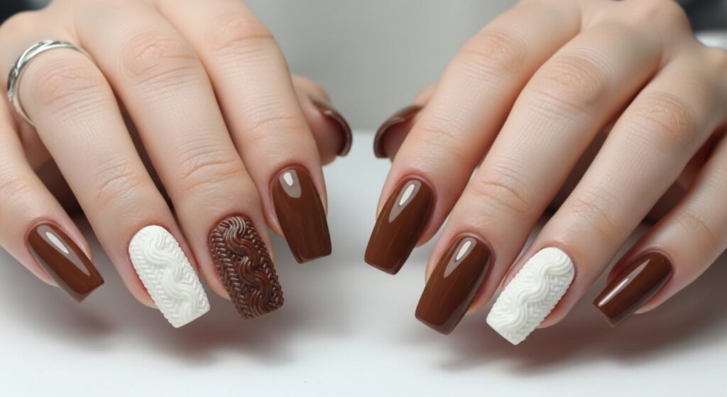 - The Design: Using a thick 3D builder gel, your nail tech creates a raised, intricate pattern that mimics the twist of a knitted sweater.