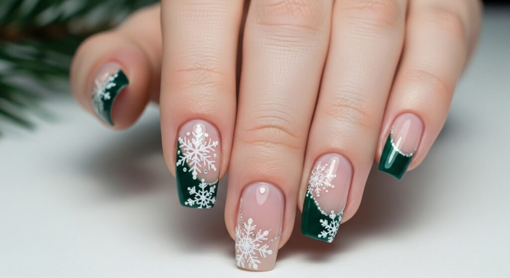 Use Matcha Green Gel on most fingers. Choose one accent nail for a Milky Nude base with minimal White Snowflake art and subtle Gold Glitter Dust near the cuticle.