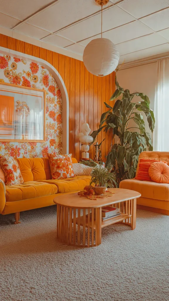 If you prefer a modern twist, use 70s-inspired wallpaper on a single accent wall. It adds nostalgia without overwhelming the room.