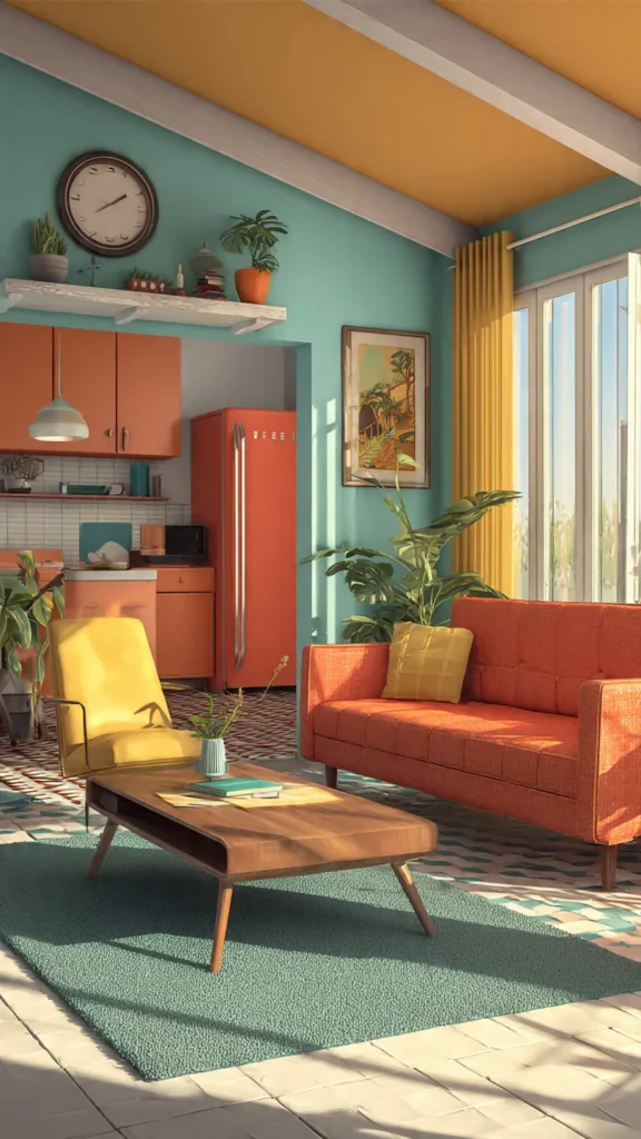 Use these colors for accent walls, upholstery, and decorative accents. Pair them with natural materials like wood, rattan, and cork for the ultimate retro feel.