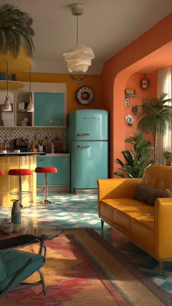 Use a mix of vintage and modern furniture. Choose a retro color palette, add a shag rug, and pair it with sleek lighting or chrome accents. Balance is key — blend nostalgia with modern comfort.
