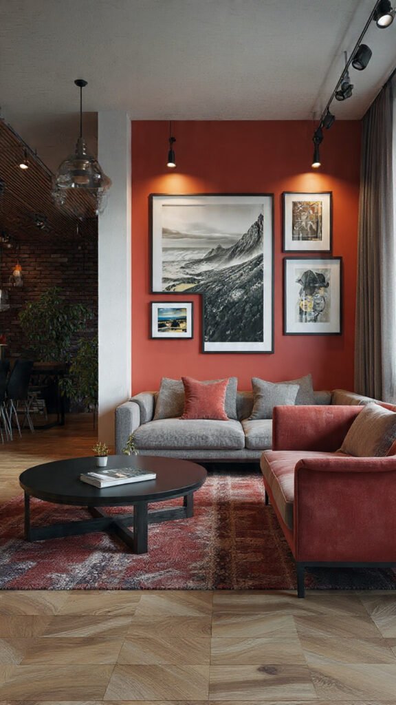 Apartment wall decor ideas include gallery walls with framed photos, floating shelves for books or decor, peel-and-stick decals or wallpaper, mirrors to reflect light, and DIY artwork or hanging tapestries.