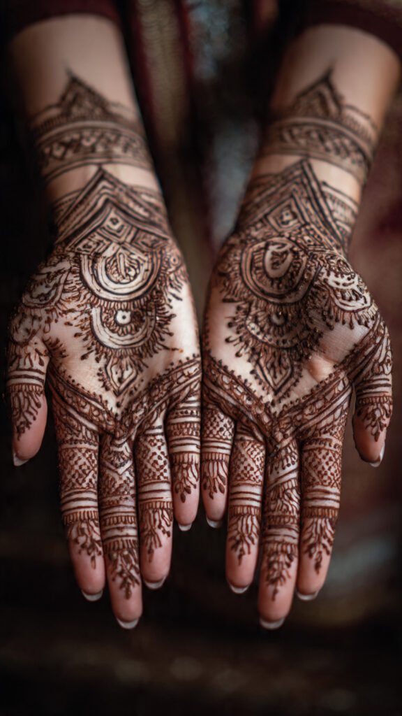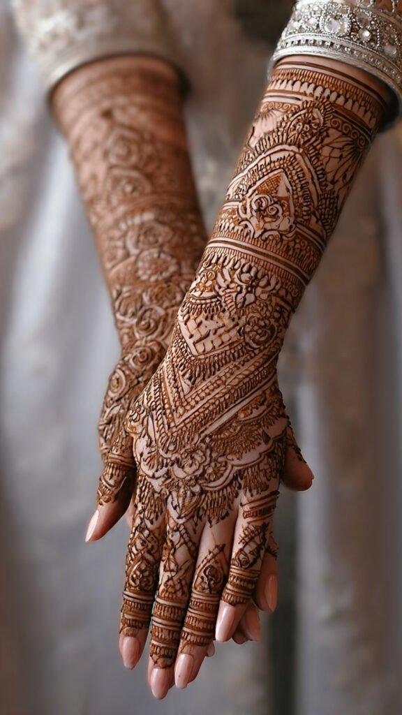 Bridal Arabic Mehndi Designs are elaborate, luxurious, and eye-catching. They cover both hands and often extend to the arms, featuring detailed florals, paisleys, and traditional motifs.