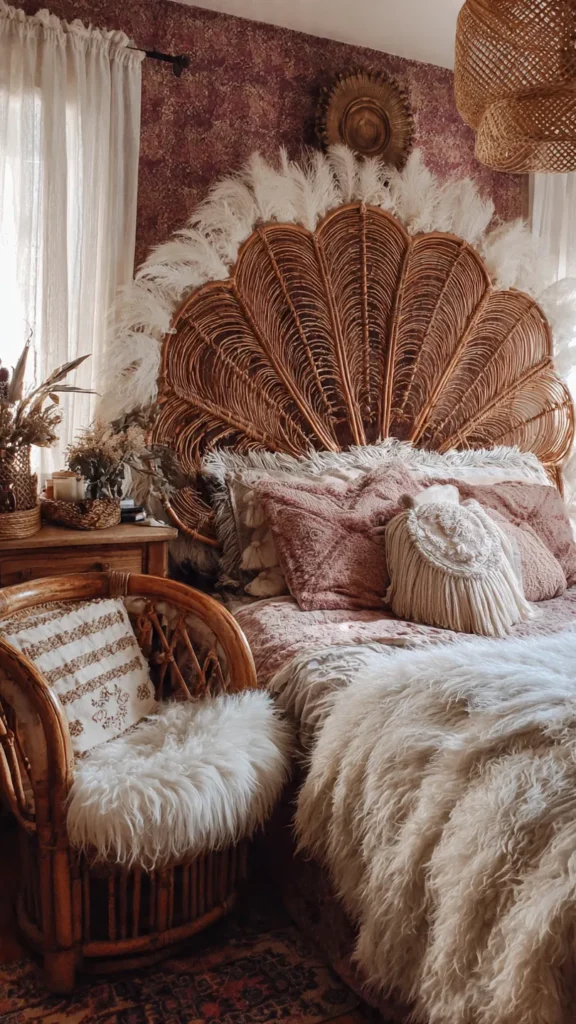 A boho chic bedroom features a mix of colors, patterns, and textures. Think macramé hangings, woven furniture, earthy tones, and indoor plants to create a cozy, artistic, and relaxed vibe.