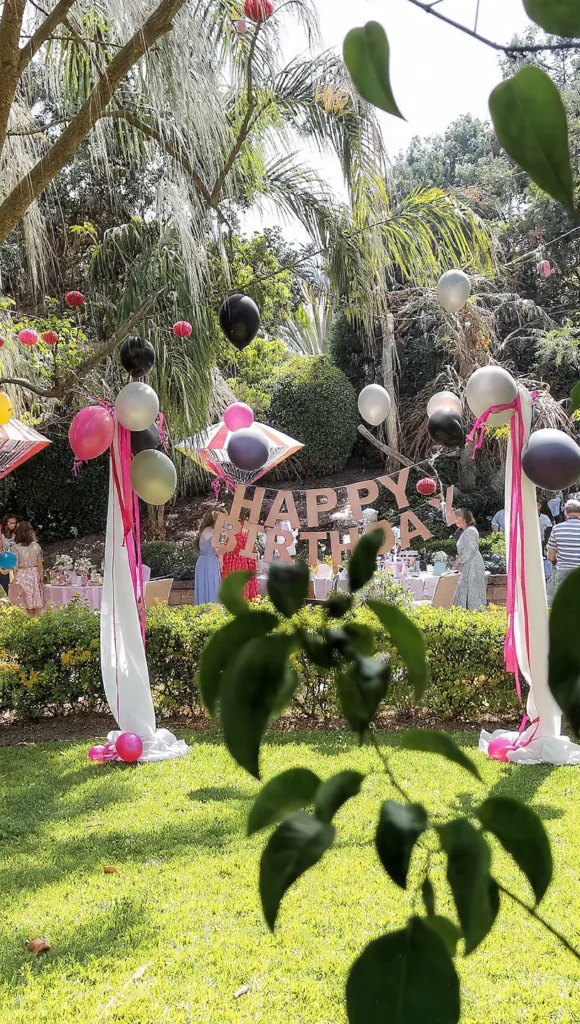 Placing a balloon arch at the garden entrance, gate, or pathway adds a celebratory touch and makes the birthday guest feel extra special. It also doubles as a perfect photo backdrop for guests.