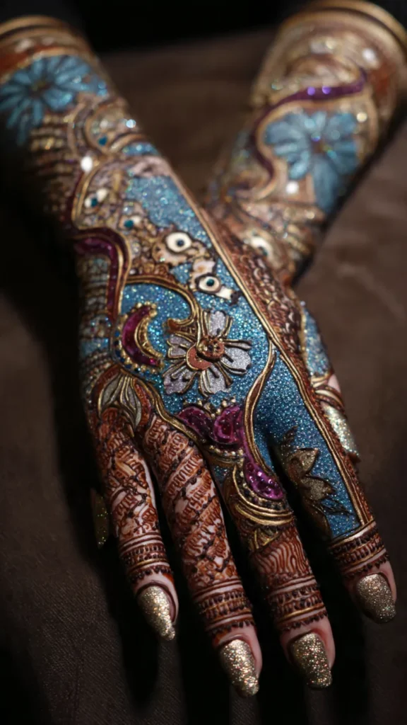 Glitter mehndi combines traditional patterns with colored glitters, stones, and body shimmer. The result is a festive, royal look that shines under wedding lights.