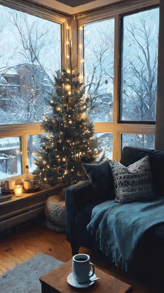 A Cozy Winter Tree Aesthetic focuses on soft textures, warm lighting, and a snowy, magical winter vibe. This style is perfect for people who want their Christmas tree to feel like a cozy cabin moment.