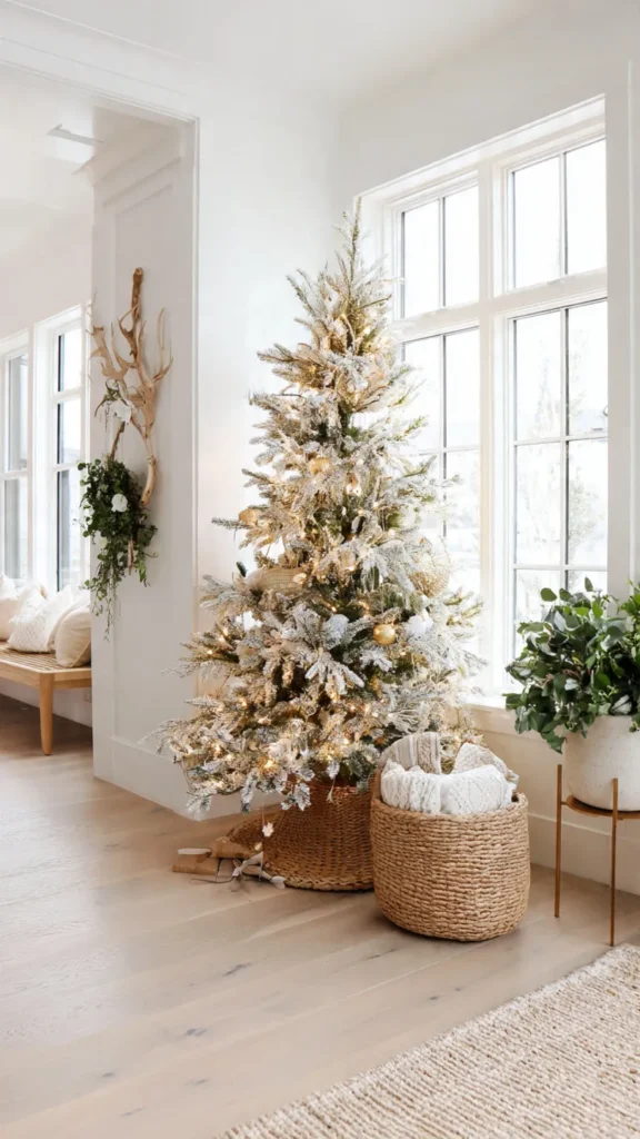 Use a slim tree or a natural evergreen for a fresh, simple look. Choose a neutral palette: white, cream, beige, wood tones, or frosted silver. Replace heavy garlands with soft fairy lights, handcrafted ornaments, and simple paper stars.