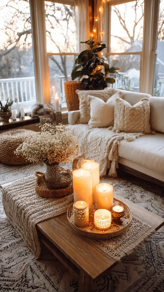 Cozy coffee table decor creates a warm, inviting atmosphere perfect for relaxation and comfort. Cozy décor uses soft textures, warm tones, and layered elements to make the space feel homey.