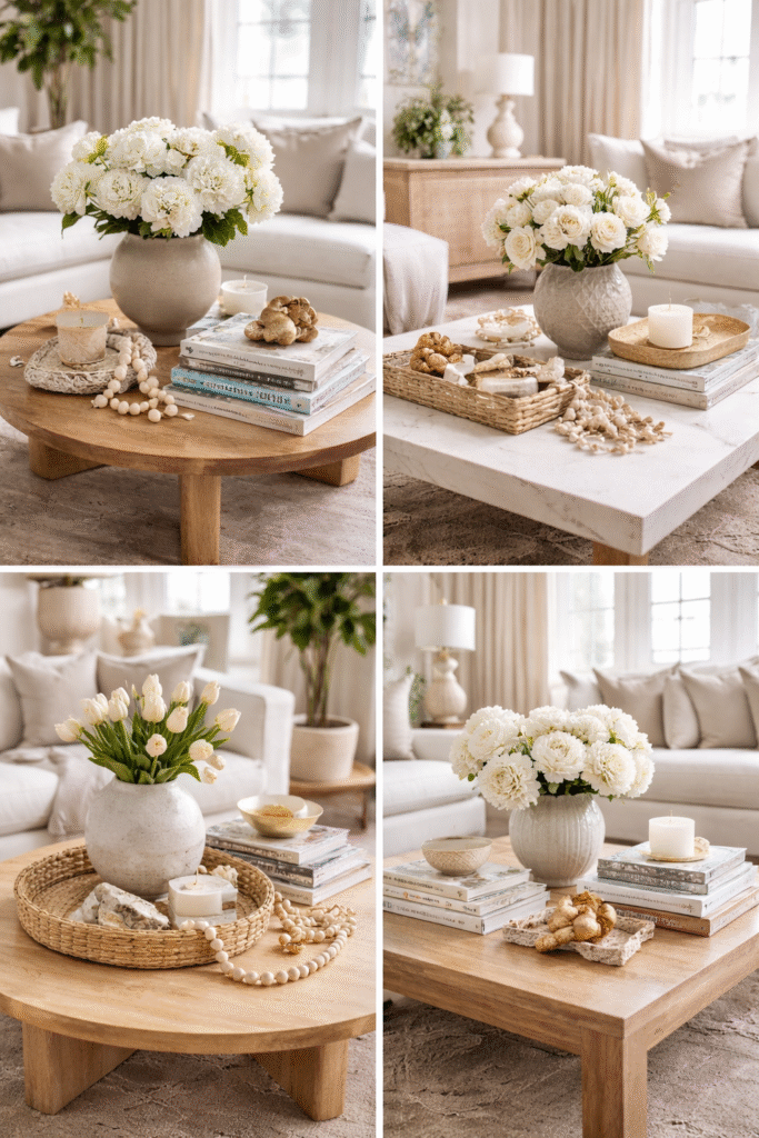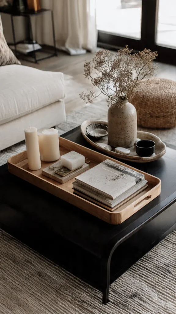 Mixing textures, colors, and heights helps create depth and draws the eye across the coffee table without cluttering it.