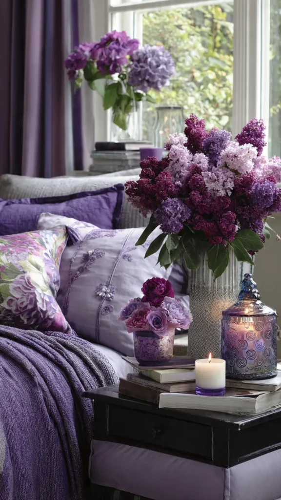 Floral purple accents add softness, texture, and natural beauty to a space. They help balance solid purple decor and make the room feel fresh and inviting.