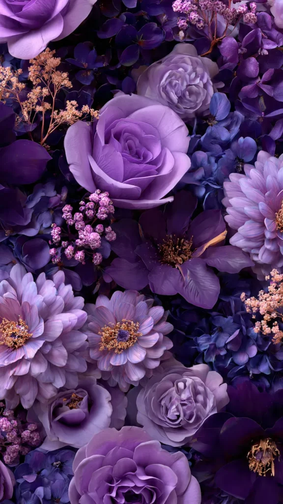 Popular floral choices include lavender stems, lilacs, orchids, and dried purple florals. These elements work beautifully in vases, wall prints, or fabric patterns.