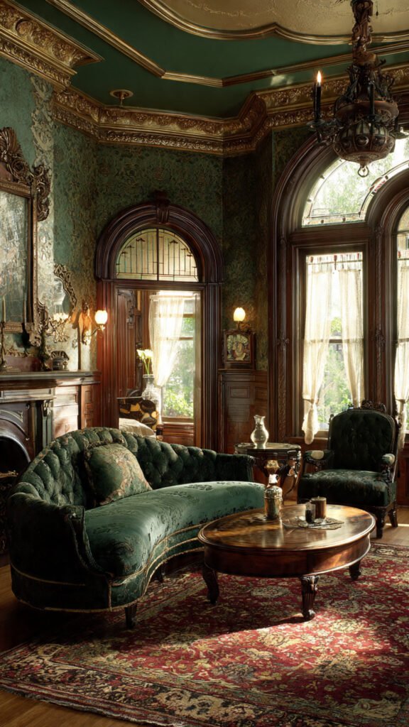 Dramatic Victorian Living Rooms use contrast, texture, and bold decor choices to create impact. These rooms feel alive and theatrical without losing comfort.