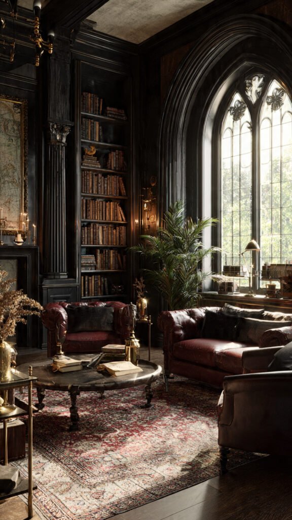 A Dark Academia Living Room combines Victorian-inspired interiors with intellectual and literary aesthetics, featuring bookcases, leather furniture, vintage rugs, and scholarly decor elements.