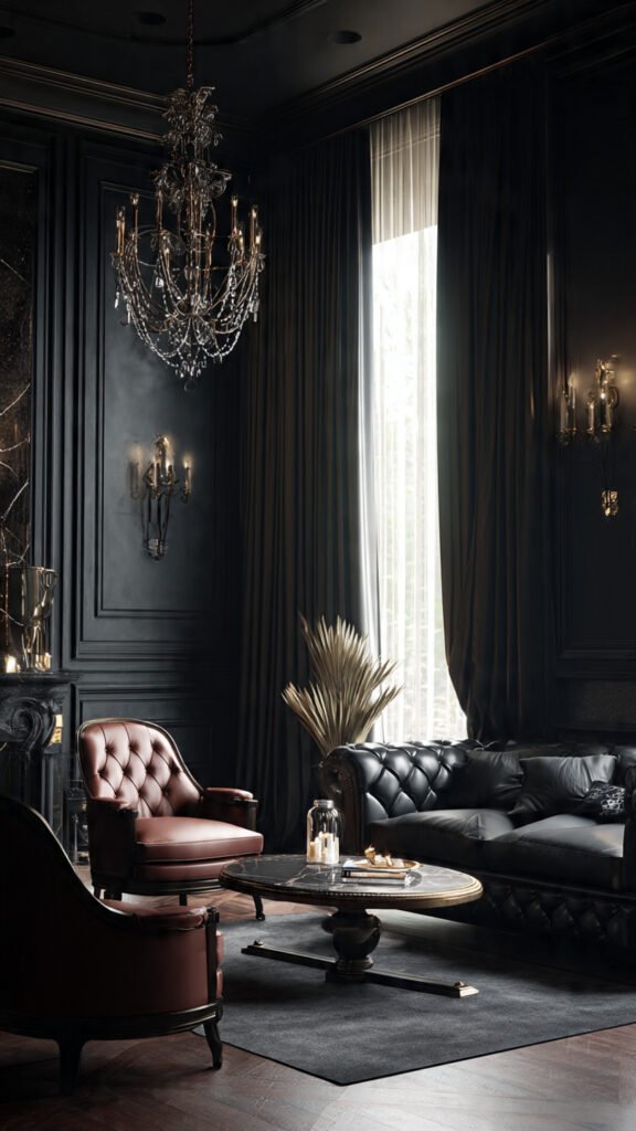 A Dark Elegant Living Room combines rich, dark colors with luxury furnishings and subtle details. It’s perfect for those who want sophistication without overwhelming darkness.