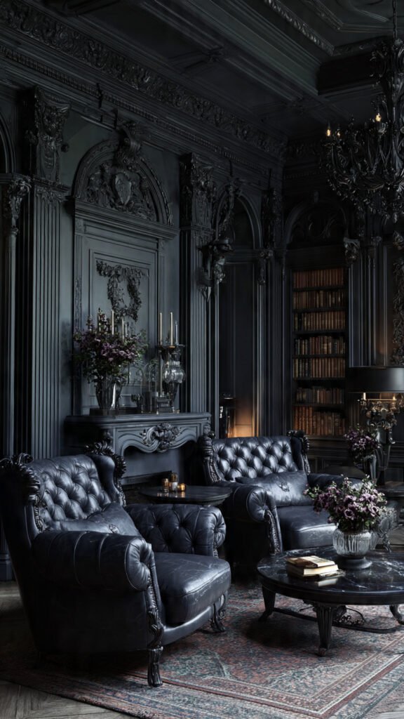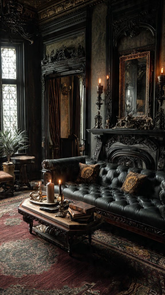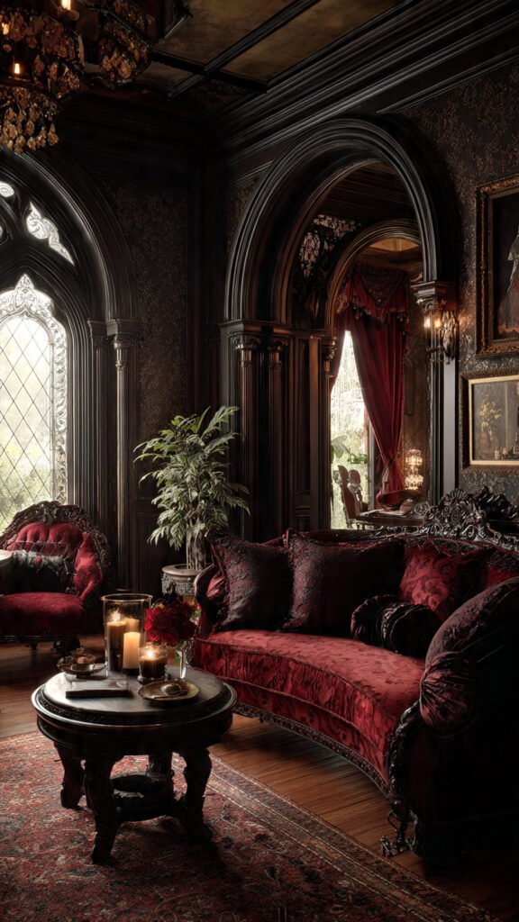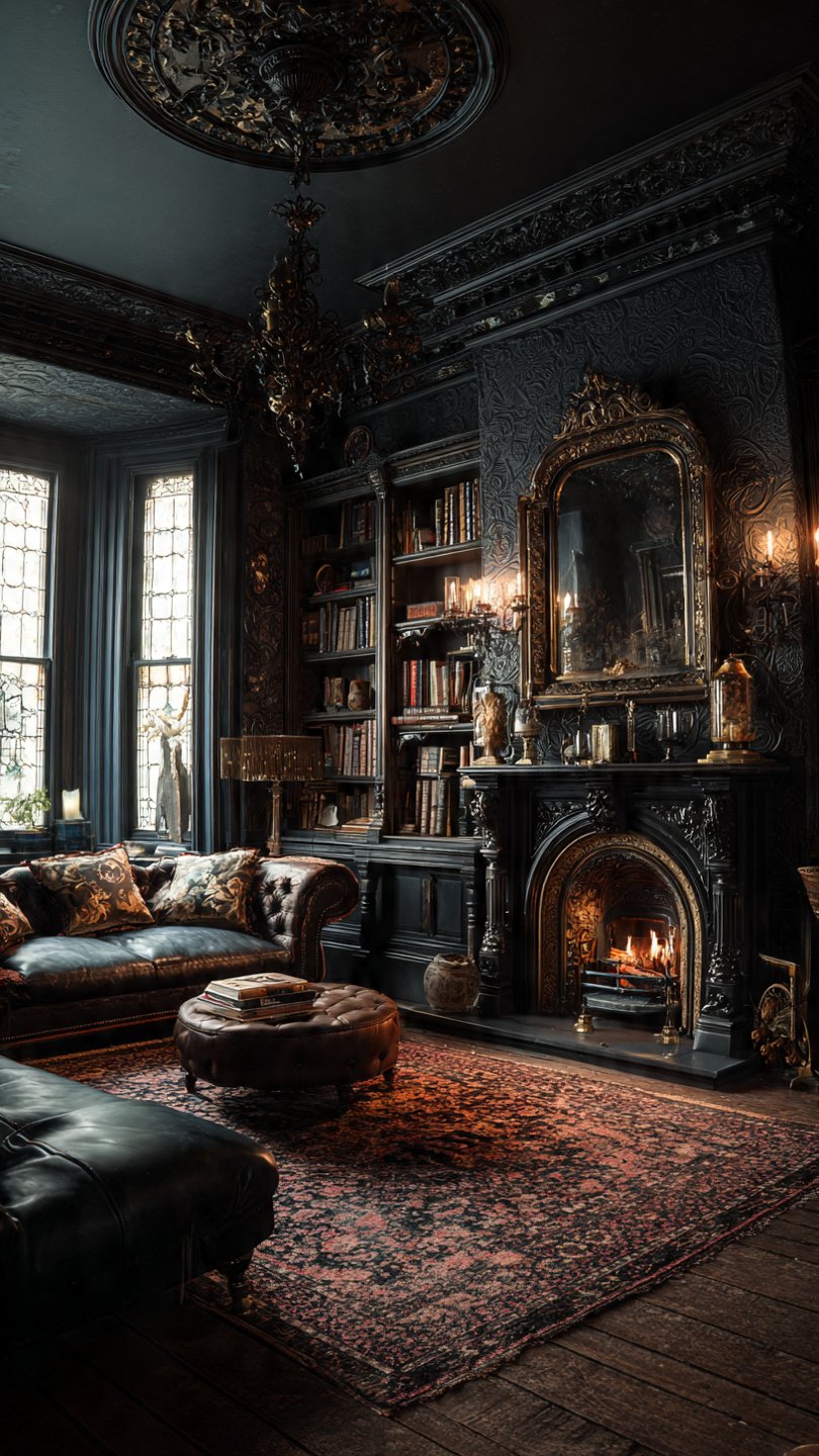 A Dark Victorian Living Room is a living space styled with deep colors, ornate furniture, rich textures, and dramatic lighting, combining historical elegance with moody, sophisticated aesthetics.
