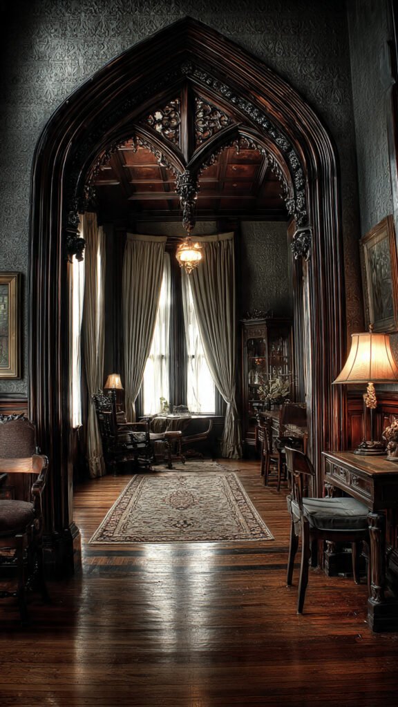 A Victorian Gothic interior emphasizes architectural details, ornate furniture, Gothic motifs, decorative moldings, and ambient lighting to create a historic, bold living space.