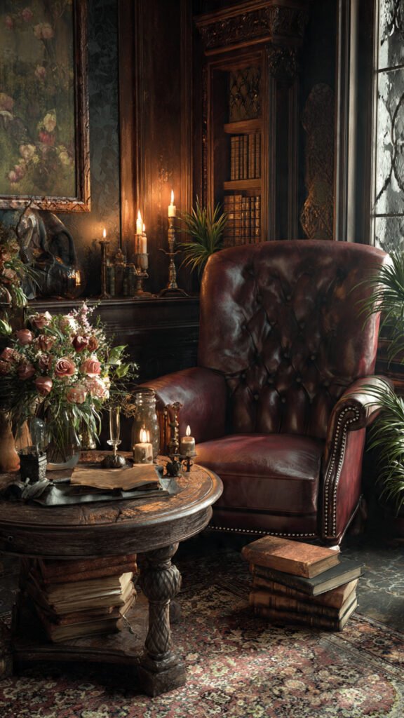 Moody Victorian Decor focuses on creating depth and atmosphere using dark colors, layered textures, and ambient lighting.
