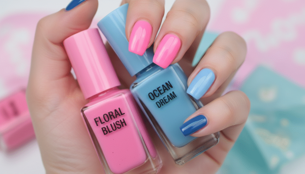 - Sponge Gradient: Apply pink and blue polish to a makeup sponge and dab it onto your nail for an instant sunset effect.