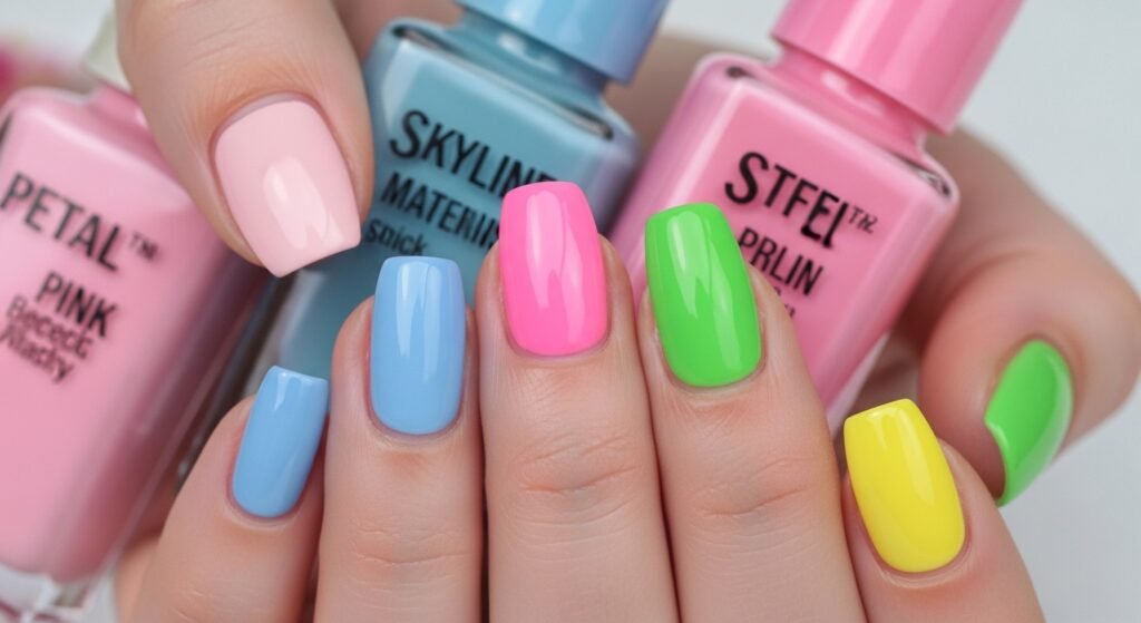 This year, the trend is clear: Multicolor Manicures. Why settle for one shade when you can have five? The “Skittles Nail” trend has evolved into a sophisticated color story where each finger represents a different petal of a spring flower.