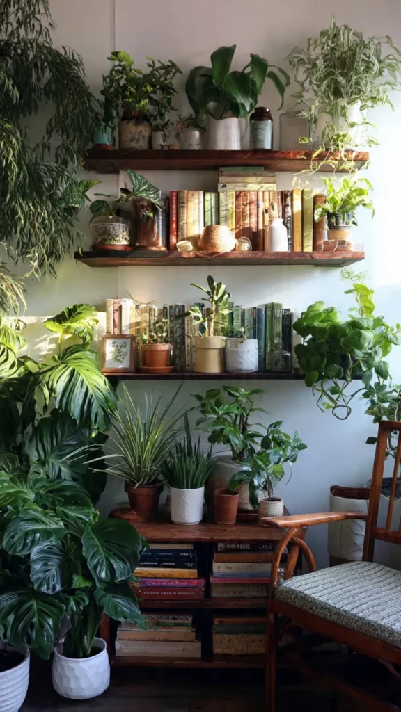 Try ladder plant shelves, terrariums, or hanging planters near windows. Mix small and tall plants for visual balance and freshness.