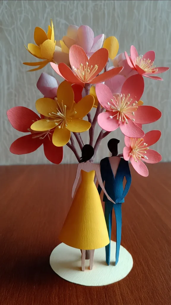 Incorporate materials like fairy lights, dried flowers, handwritten letters, and soft color palettes to make the project feel warm and intimate. For example, a romantic memory board decorated with fairy lights instantly transforms any wall into a storytelling corner. Another great idea is creating couple shadow art, where partners trace each other’s hand silhouettes or profiles.