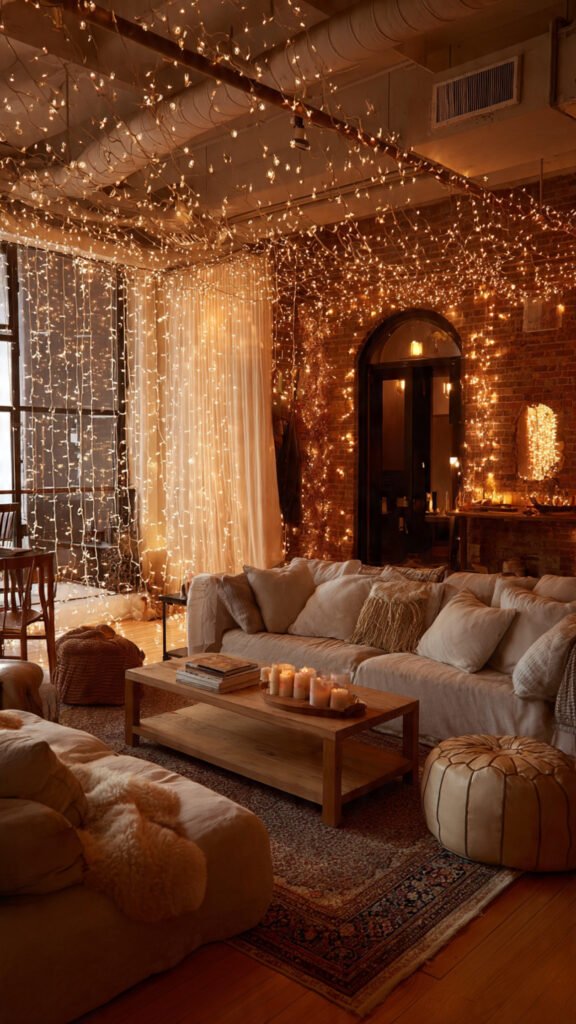 Arrange string lights along walls, shelves, or mirrors to create a warm and welcoming environment.