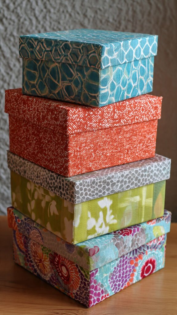 Use cardboard boxes and cover them with fabric to create attractive storage containers for clothes and accessories.