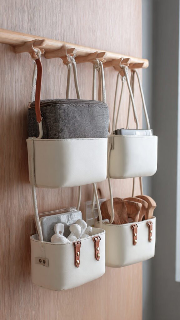 Make wall-mounted organizers using pockets, hooks, and fabric to keep small items neatly arranged.