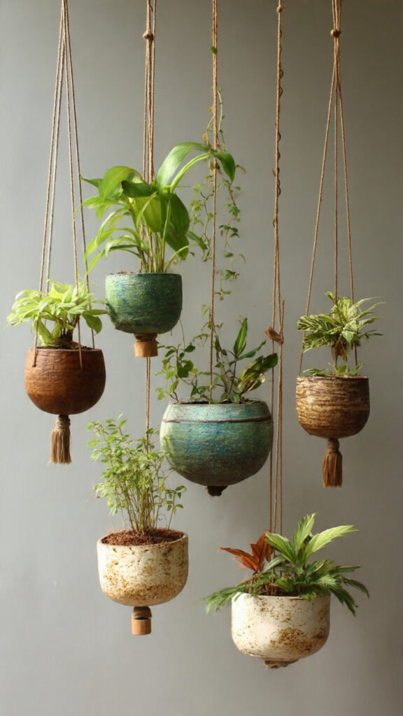 Use rope and knots to create hanging holders for plants. These save space and add a natural, decorative touch.