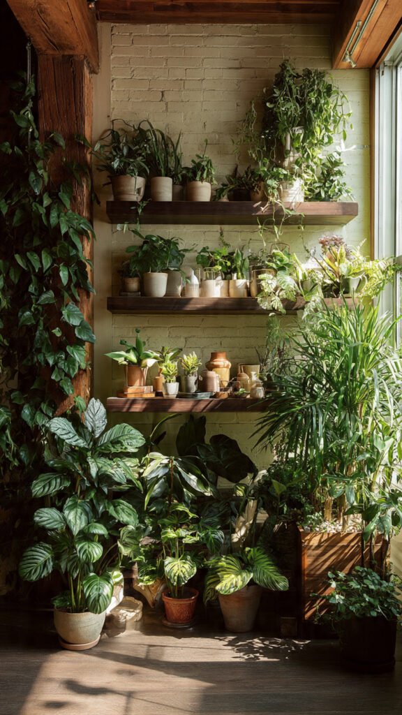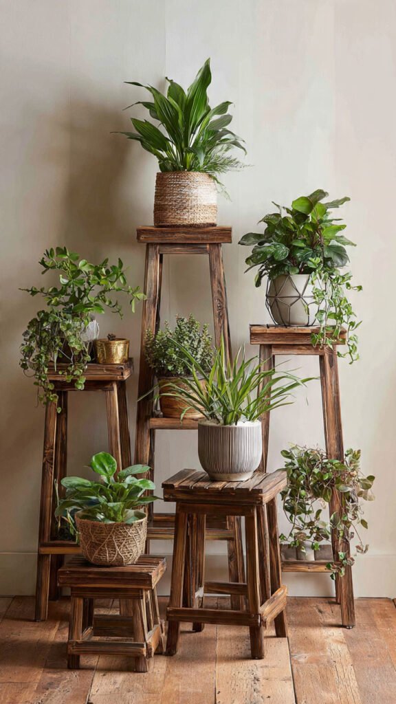 Build simple stands using wooden boards and nails to display multiple plants at different heights.