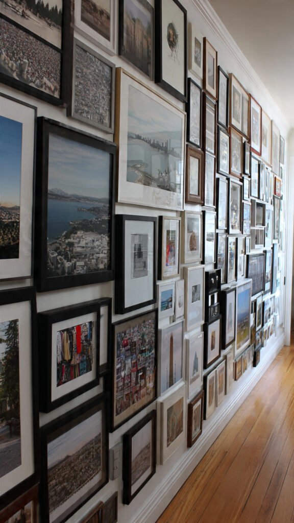 Design a personalized photo wall using family pictures, travel memories, and inspirational prints. Use matching frames or mix different styles for a modern, creative effect.