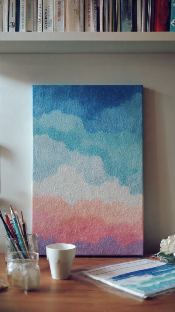 Create abstract paintings using acrylic paint, canvas, and simple brush techniques. You can also frame fabric patterns, printed quotes, or pressed leaves for a natural and artistic look.