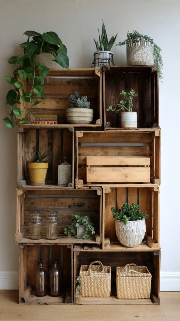 Stack and mount wooden crates to create open shelves for books, shoes, or decorative items.
