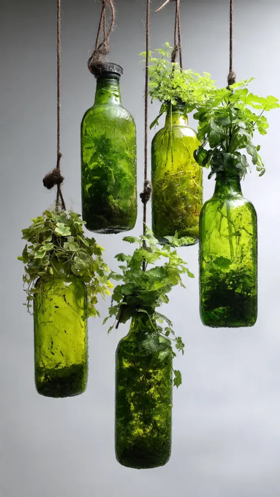 You can paint bottles, wrap them in rope, or hang them using macramé holders. These planters are ideal for kitchens, balconies, and window areas.