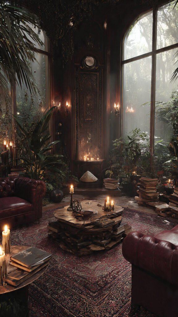 Mystical decor feels cozy but dramatic.
