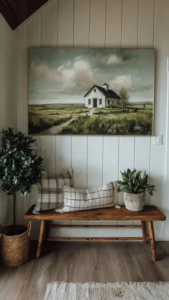 If you want a softer look, try painting neutral landscape art or nature-inspired patterns. These subtle designs match the calm and cozy vibe of farmhouse style.