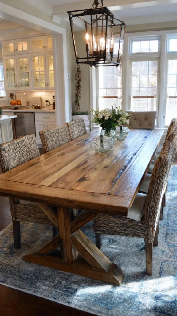 Farmhouse décor is known for its simplicity, functionality, and charm. It blends old-world warmth with modern comfort. To enhance your farmhouse dining room table, consider adding:
