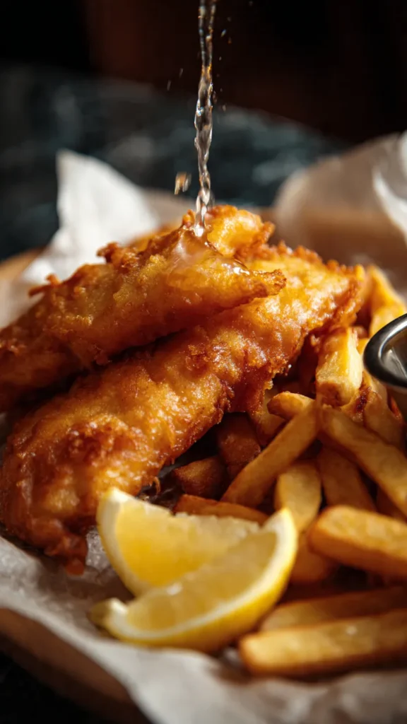 Fish and chips are best enjoyed fresh from the fryer. Serve with classic accompaniments like malt vinegar, tartar sauce, or lemon wedges.