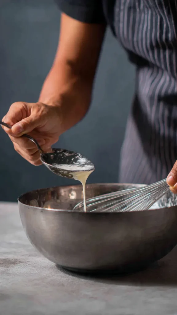 - Gradually whisk in cold sparkling water or beer until the mixture is smooth.
