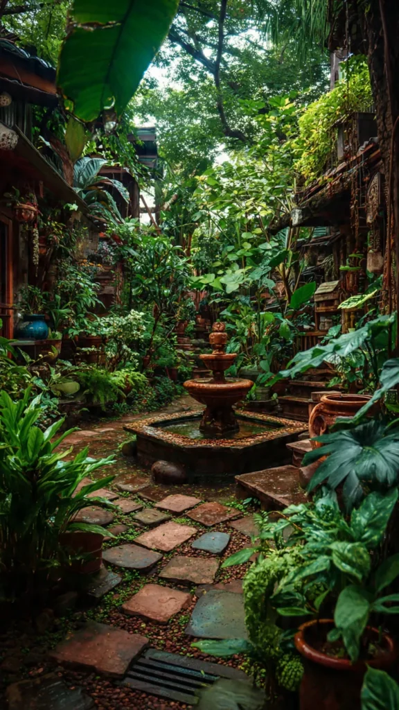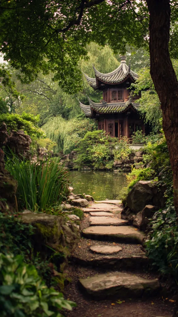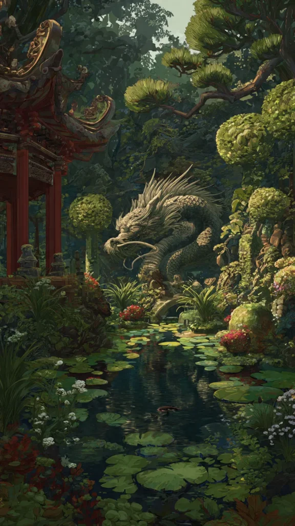 A themed garden inspired by mythology or Asian culture, often featuring dragon sculptures, koi ponds, bonsai, and lanterns.