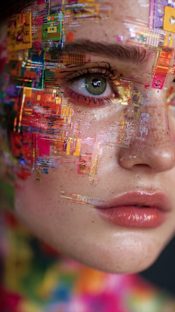 Here’s where the real creativity begins. Digital glitch makeup art mimics broken pixels, distorted lines, and screen errors.