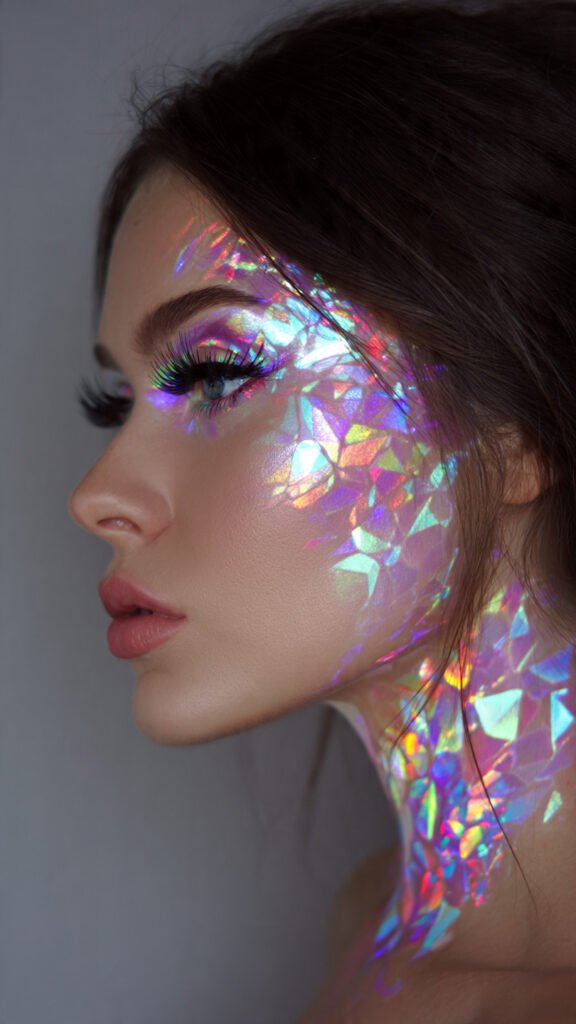 If you love shine and color shifts, holographic makeup style is your best friend.