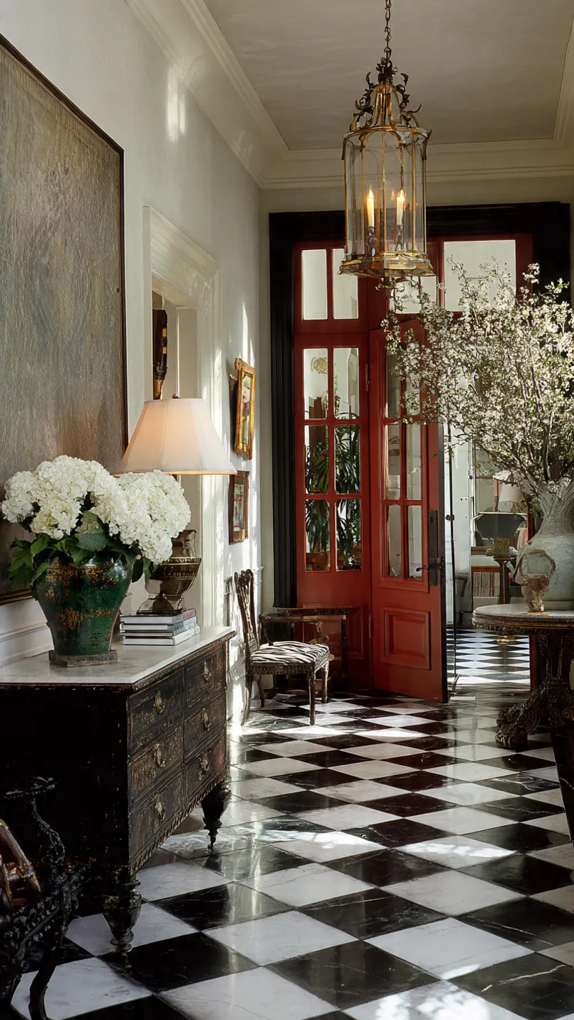 High-contrast decor instantly makes an entryway feel bold and dynamic. Pairing light and dark elements creates visual interest and a strong design statement.