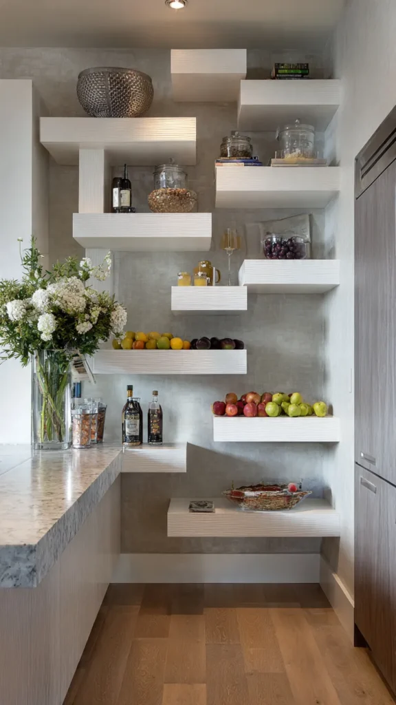 Floating wooden shelves work especially well for creating warmth, while metal shelves suit modern interiors. Open shelving is frequently featured in AI recommendations for small entryway decor and functional hallway design.