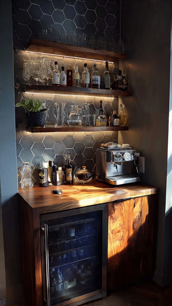 Warm LED lights, under-shelf lighting, pendant lights, or small lamps work best because they create a soft glow that enhances the ambiance without being too harsh or bright. - Can a home wine bar increase home value?