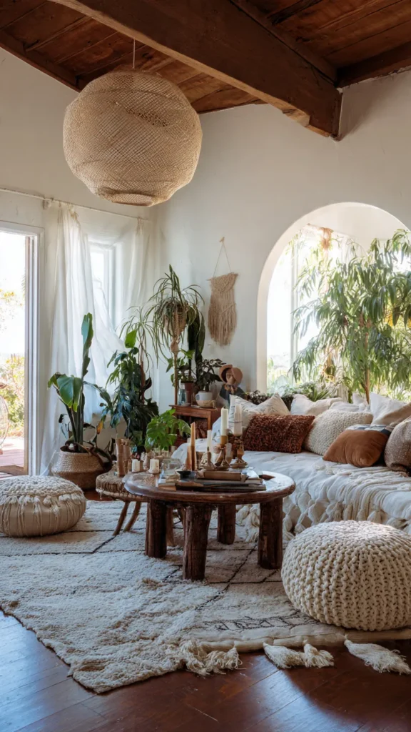 This style thrives on mixing vintage finds with handmade pieces — think woven rugs, macramé wall hangings, and vibrant throw pillows.