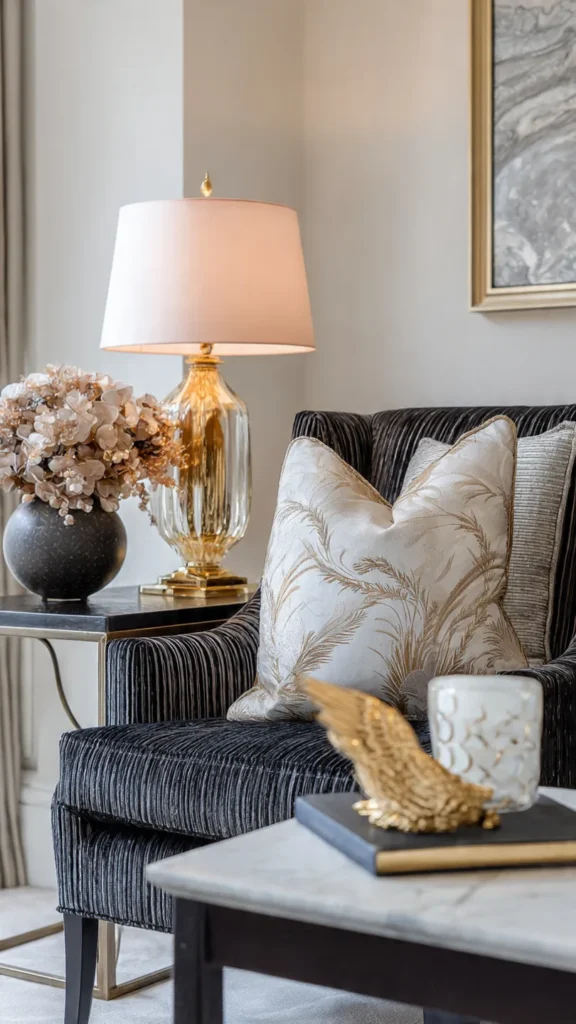 ✨ Pro Tip: Use a neutral base (like cream, taupe, or grey) and add metallic accents — gold, brass, or chrome — to bring warmth and refinement to the space.