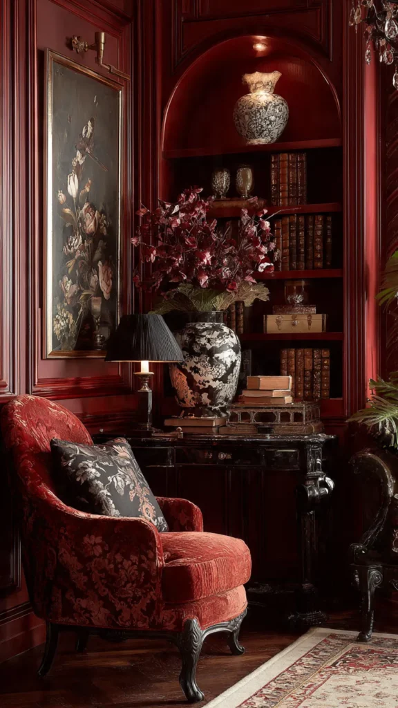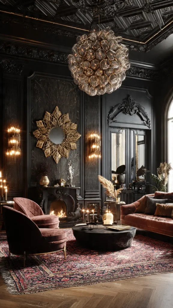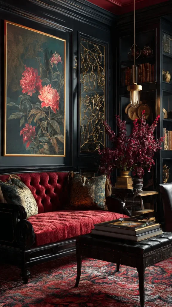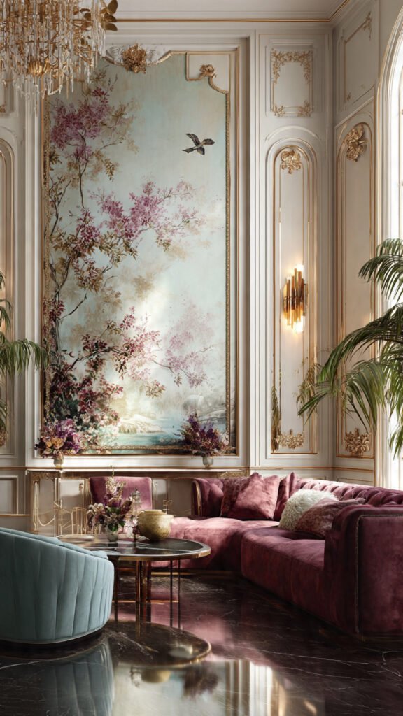 - Rich materials: Velvet upholstery, silk drapes, and gold or brass accents.